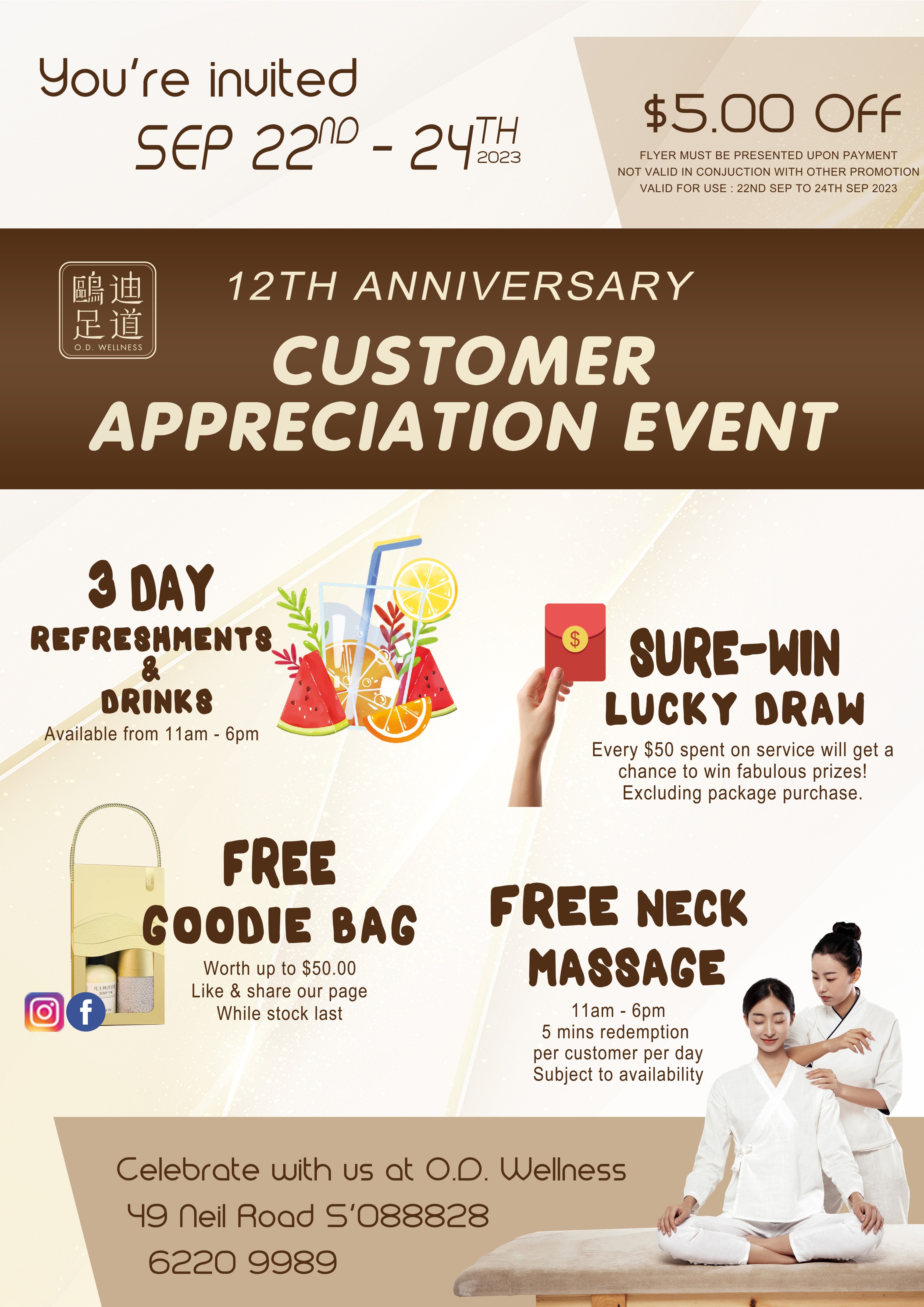 Dear Valued Customer, You are cordially invited to our 3-day 12-year Client Appreciation Party at our O.D. Wellness Neil Road outlet from 22nd September to 24th September 2023. Join...